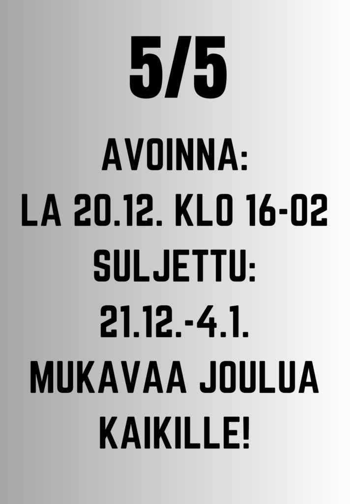 8.9.2021 Hei kaikki! Me 5/5 oltiin sitä mieltä että viikonloppu on yksinyrittäjälle riskaabeli bisnes ja ollaan mieluummin rauhallisemmat päivät avoinna. Palaamme normaaliin heti kun/jos nuoriso jaksaa käydä rokotteessa